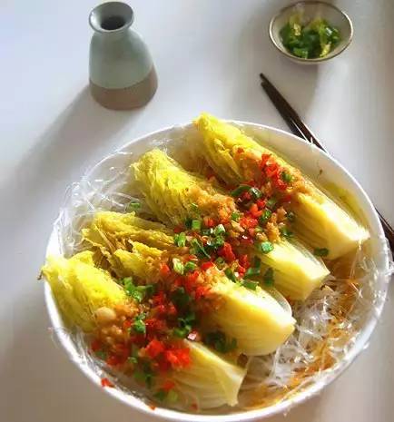 5.中間鋪上小白菜、粉絲和香菇,撒上細(xì)鹽,再加一點點糖提味