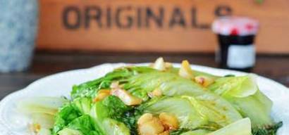 2.把洗凈瀝干水的生菜丟進(jìn)去鍋子里,放入爆香的蒜頭