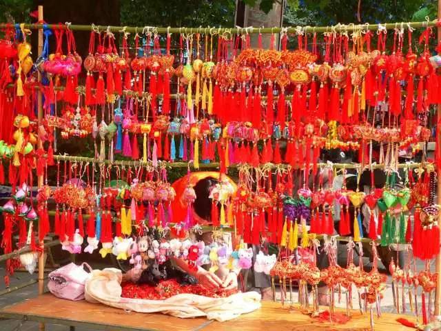 端午節(jié)小孩佩香囊,傳說有避邪驅瘟之意,實際是用于襟頭點綴裝飾。香囊內(nèi)有朱砂、雄黃、香藥,外包以絲布,清香四溢,再以五色絲線弦扣成索,作各種不同形狀,結成一串,形形色色,玲瓏可愛。