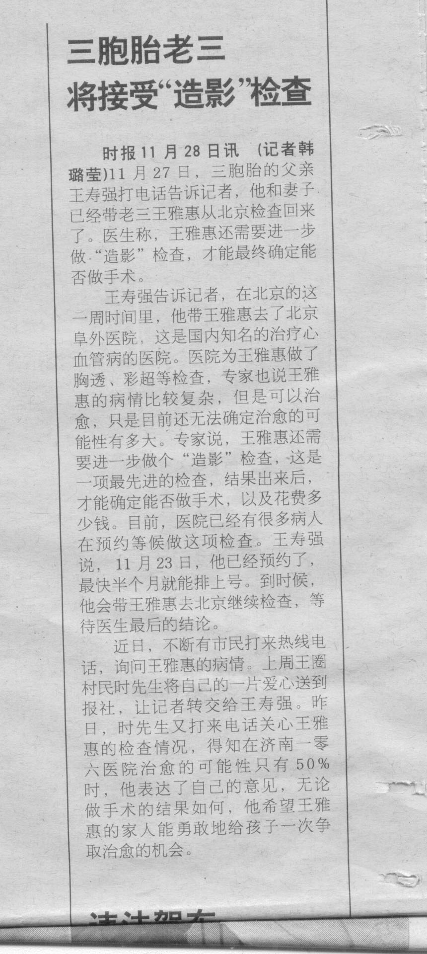 三胞胎最新動態(tài):將接受“造影”檢查
